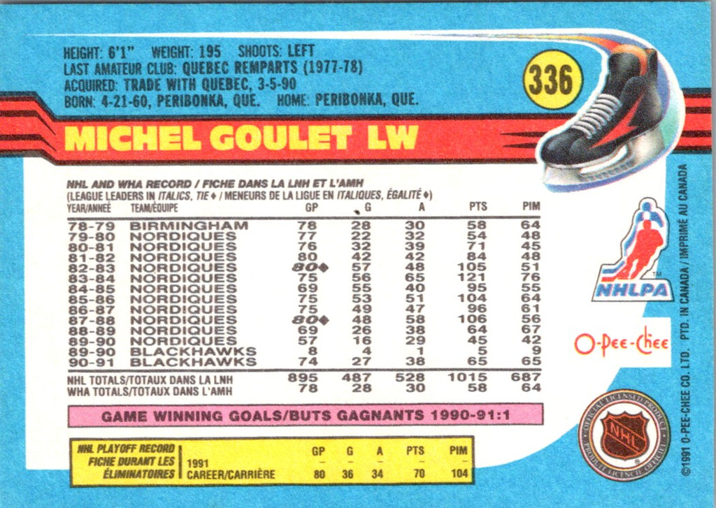 This 1991 O-Pee-Chee Michel Goulet #336 hockey card is a must-have for any fan of the legendary Chicago Blackhawks. Featuring a classic black and white photo of Goulet, this card is a great addition to any collection. Goulet was an integral part of the Blackhawks' success in the early 90s, and this card is a great way to commemorate those achievements. With a glossy finish and bright colors, this card is sure to stand the test of time. Add this classic card to your collection today!