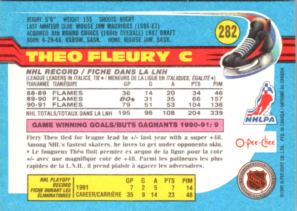 This 1991 O-Pee-Chee Theo Fleury #282 from the Calgary Flames is a must-have for any hockey fan! This card features Fleury at the peak of his career, wearing the iconic red and yellow Flames jersey. This card is sure to be a great addition to any hockey card collection! With its bright colors and great design, it's sure to be a conversation starter for any fan of the game. Get your hands on this classic card today and show off your Flames pride!