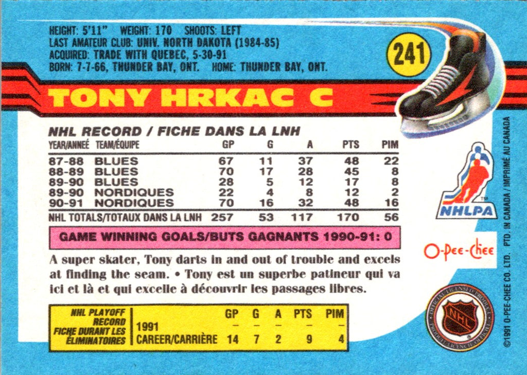 This 1991 O-Pee-Chee Tony Hrkac #241 San Jose Sharks card is the perfect addition to any hockey card collection. Featuring a crisp, clear image of the Sharks forward, this card is sure to stand out in any collection. This card is an excellent way to commemorate Tony's career and show your Sharks pride. Add this card to your collection today and make sure you never miss out on a chance to show off your favorite team.