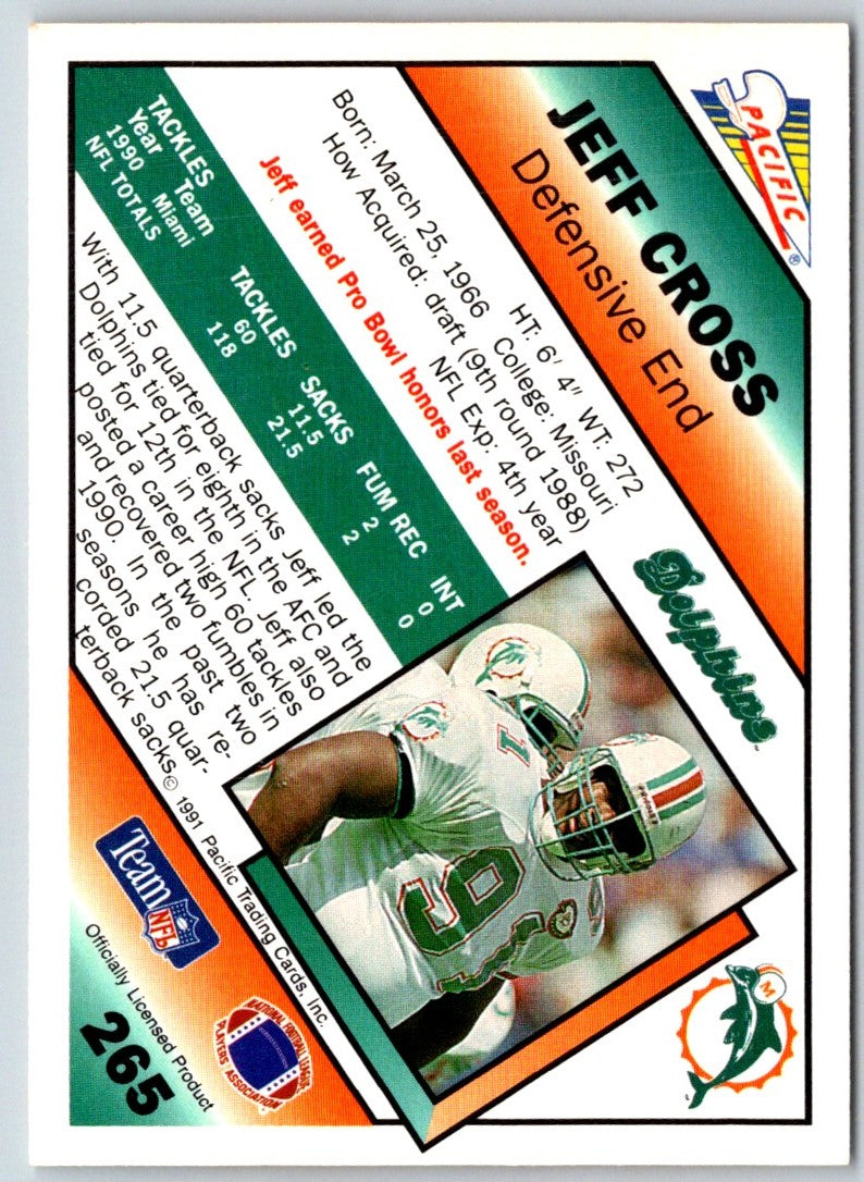 This 1991 Pacific Jeff Cross #265 Miami Dolphins card is a must-have for any collection! Featuring a glossy finish, this card captures Jeff Cross on the field in all his glory. Perfect for any Dolphins fan, this card is sure to be a crowd pleaser. With amazing detail, this card is sure to make any collection stand out. Whether you're a rookie collector or a seasoned one, this card is a must-have for any true fan. Get it now and show off your Dolphins pride!