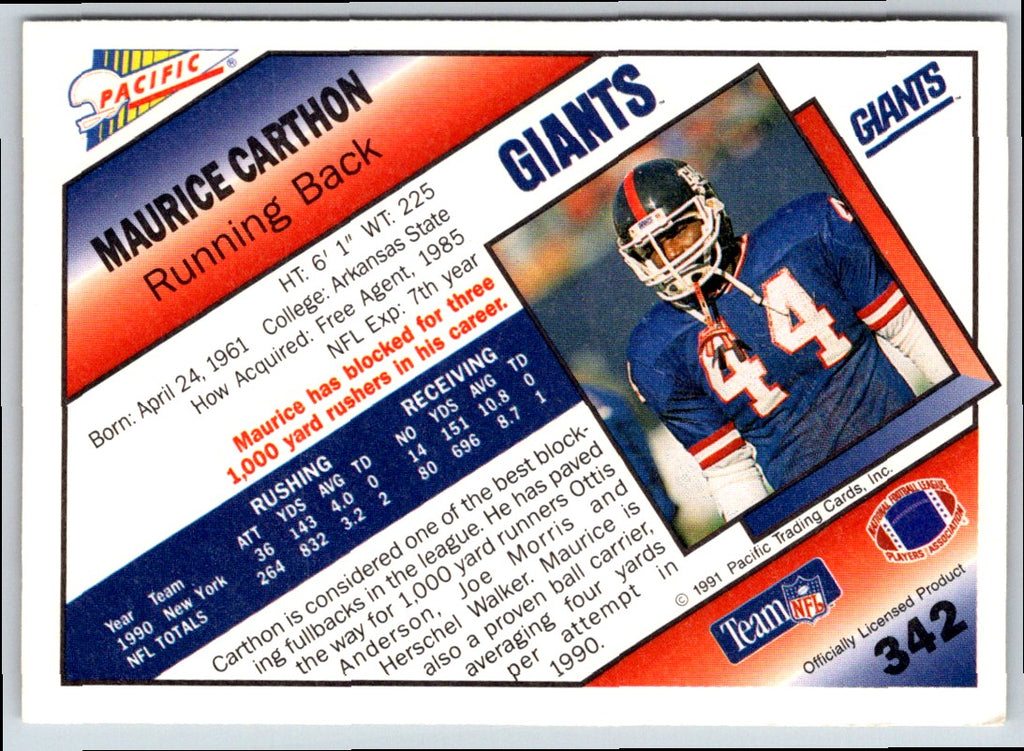 This 1991 Pacific Maurice Carthon #342 New York Giants card is a must-have for any Giants fan! Featuring an action shot of Maurice Carthon in his Giants uniform, this card is sure to be a centerpiece in any collection. The vibrant colors and crisp details on the card make it a great addition to any fan's memorabilia collection. With this card, you can relive the glory days of the New York Giants and remember the great Maurice Carthon. Add this card to your collection today!
