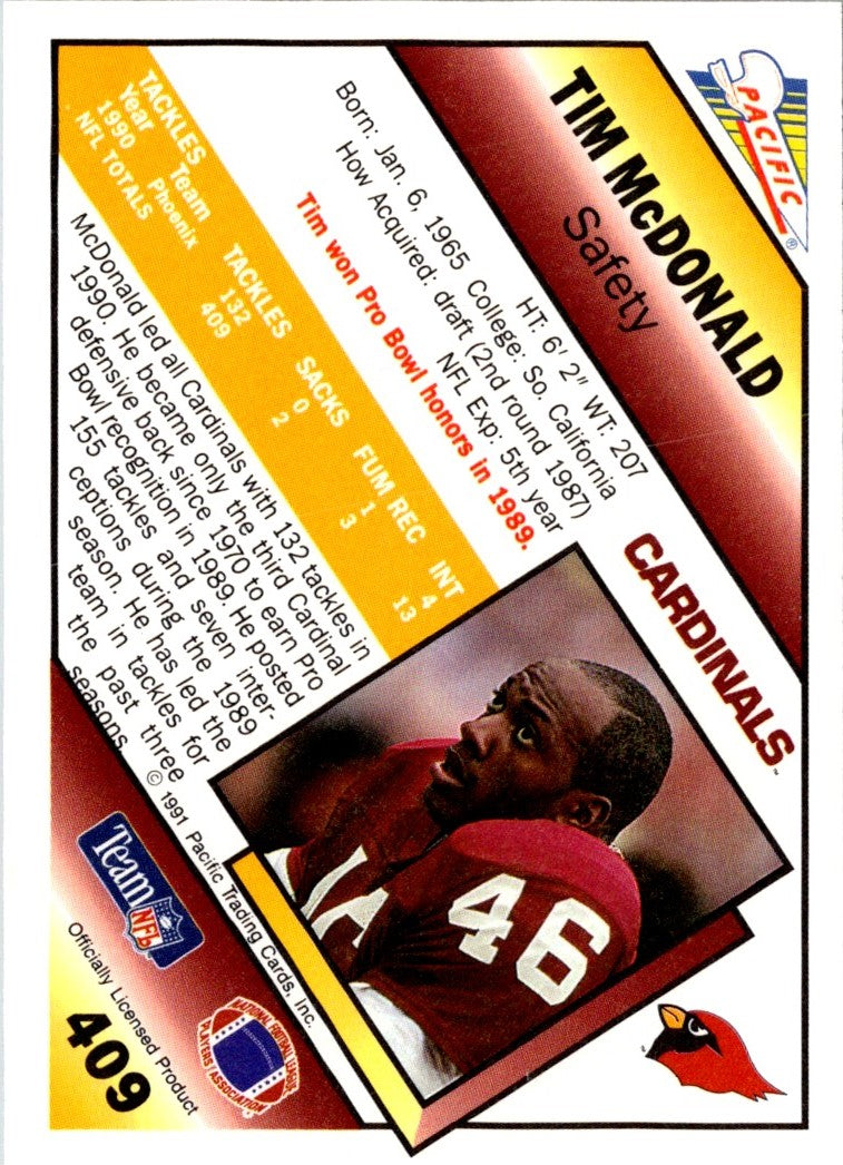 This 1991 Pacific Tim McDonald #409 Phoenix Cardinals card features the linebacker in a classic mid-action pose in the team's iconic colors. This card is in near-mint condition and is an essential for any collector of the team or player. McDonald played 11 seasons in the NFL and was a five-time Pro Bowl selection. He was also a member of the Cardinals' 20th anniversary team. Add this card to your collection today and you won't be disappointed.