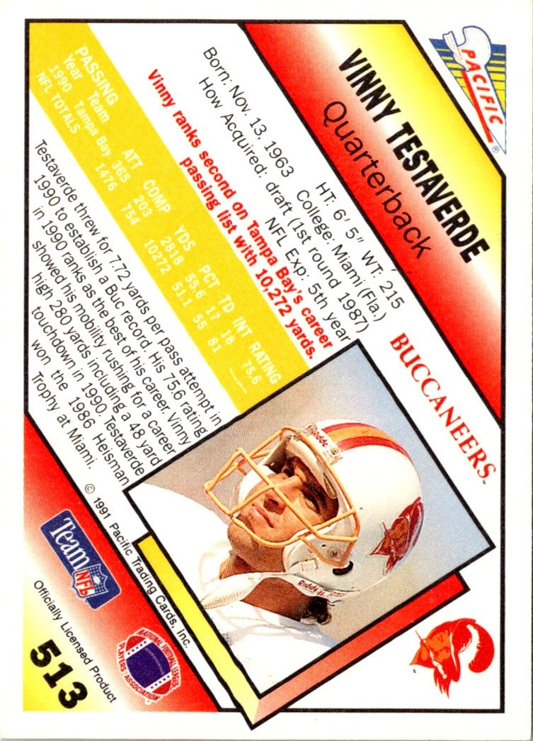 This 1991 Pacific Vinny Testaverde #513Tampa Bay Buccaneers card is a valuable addition to any football fan's collection. Testaverde was a Pro Bowl quarterback and led the Buccaneers to the playoffs in 1997 and 1999. This card features Testaverde in his classic Buccaneers uniform, and captures his passion and intensity for the game. Perfect for any die-hard Bucs fan, add this card to your collection today and show your support for the legendary Vinny Testaverde.