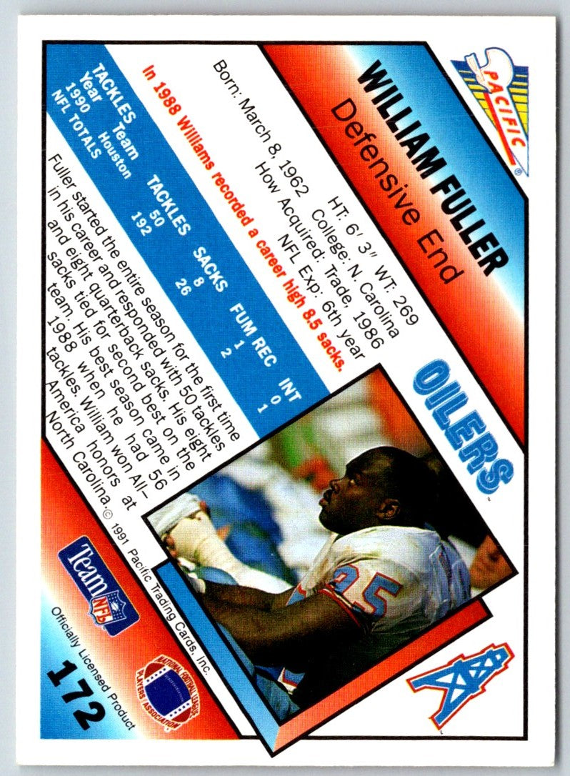 This 1991 Pacific William Fuller #172 Houston Oilers card is a must-have for any NFL fan or collector. Showcase your team pride with this classic edition of the Pro Bowl defensive tackle! Featuring a vibrant design, this card will be a great addition to any collection. With its authentic design and collectible value, you won't want to miss out on this item!
