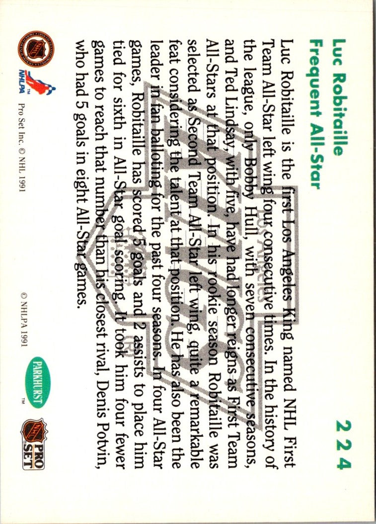 This 1991 Parkhurst Luc Robitaille card with #224 from the Los Angeles Kings is the perfect addition to any hockey collection. The card features a vibrant image of Robitaille in his Kings jersey, looking ready to take the ice. The card's reverse side includes a detailed bio of Robitaille's career stats. It's a must-have for any Luc Robitaille fan or Kings fan looking to commemorate one of the greatest players in the history of the team. Add this card to your collection today!