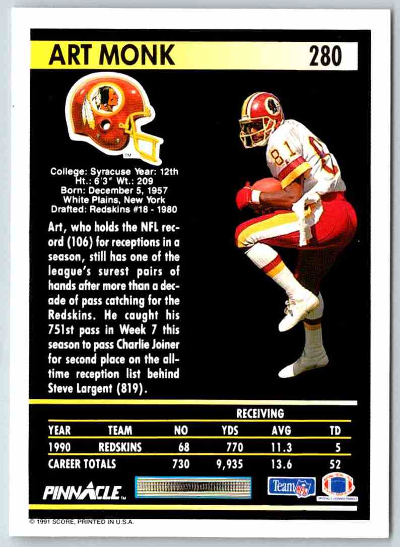 This 1991 Pinnacle Art Monk #280 card is an essential piece for any Washington Redskins fan! Boasting a detailed, full-color portrait of the legendary wide receiver, this card is sure to add a touch of class to any collection. With its vibrant colors and iconic image, this card is sure to stand out in any collection. The card's card stock is durable and designed to last, making it a perfect addition to any sports memorabilia collection. Show your support for the Redskins and your admiration for Art Monk with this timeless card!