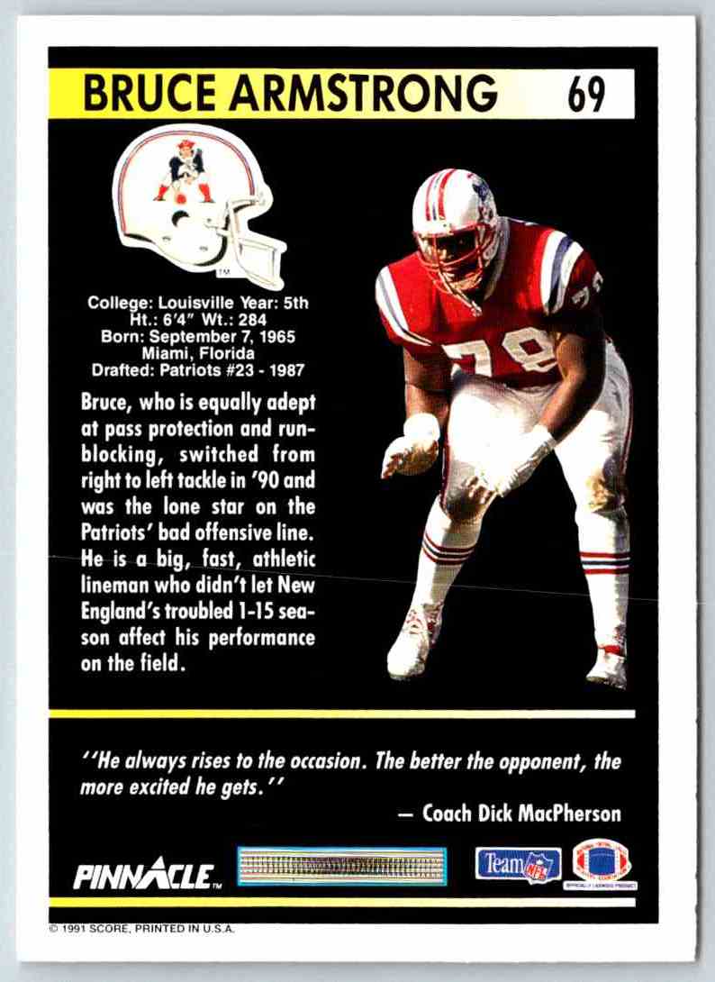 This is your opportunity to own a piece of sports history with the 1991 Pinnacle Bruce Armstrong #69 card. This iconic card features the Hall of Fame New England Patriots offensive tackle in his full uniform, ready for action. The card is printed on a glossy stock and features a vibrant full-color image of Armstrong. With a sharp focus and vivid colors, this card captures the full intensity of the gridiron. Celebrate the career of this legendary player by adding his card to any collection today!