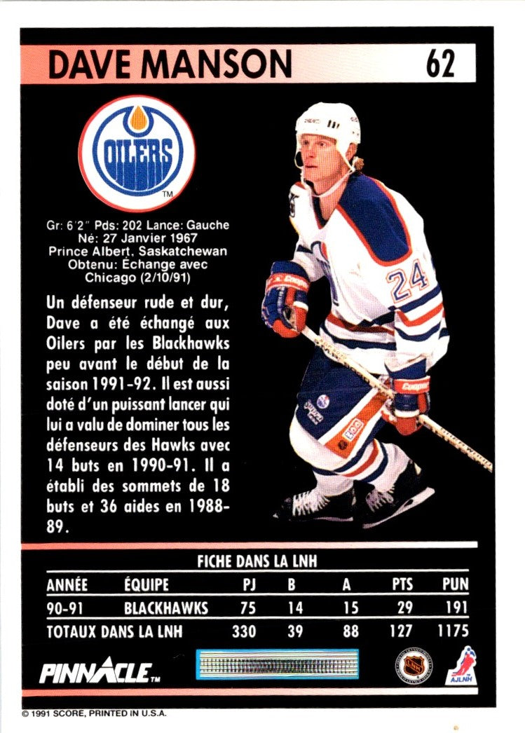 This 1991 Pinnacle Dave Manson card features the Edmonton Oilers defenseman in full action. It's a great collector's item for any Oiler fan, or hockey fan in general. The card has a classic design with a glossy finish, perfect for storing in any collection. The image of Manson on the card captures the player in full stride, ready to take on any opponent. The back of the card has detailed stats, making it a great way to remember the player and his career. Get this card and remember one of the greatest defensemen to ever take the ice.