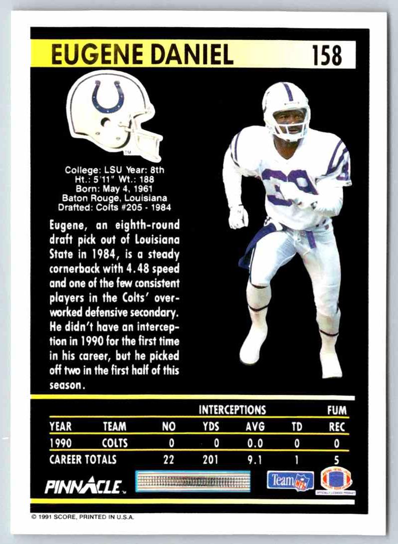 This 1991 Pinnacle Eugene Daniel #158 card captures the essence of the Hall of Fame defensive back in all his glory. The card features a color photograph of Daniel on the field, decked out in his signature uniform. The card's back is adorned with a detailed biography, stats, and awards, including his 1983 Pro Bowl selection. This card is a must-have for any collector that cherishes the greats of the past.