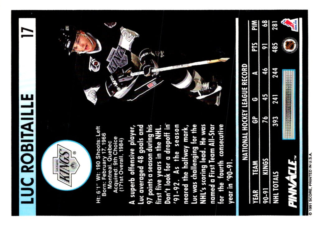 This 1991 Pinnacle French Luc Robitaille #17 Los Angeles Kings card is a great collectible for sports fans. Featuring the Hall of Fame winger in his classic Kings uniform, it's a must-have for any hockey fan. With vibrant colors and a glossy finish, this card is sure to make a great addition to your memorabilia collection. Show your support for the legendary Luc Robitaille and the Los Angeles Kings with this timeless card.
