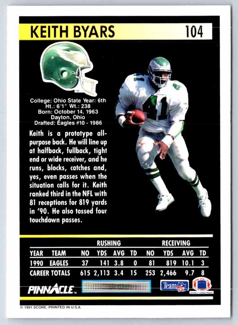 This is your chance to own a piece of history with the 1991 Pinnacle Keith Byars #104 trading card. Featuring an iconic photo of Byars ready to make a run, this collectible card is sure to be a great addition to any fan's collection. With its crisp edges and authentic design, this card is sure to be a conversation starter. Byars was a multi-talented player and was rapidly becoming one of the most complete players in the NFL. Now you can show your support and admiration for Byars with this special trading card. With its timeless design, this card will be a memorable part of your collection for years to come.