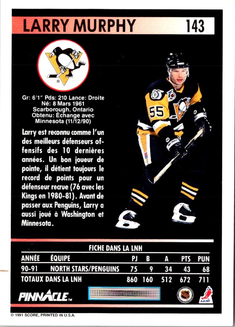 This 1991 Pinnacle Larry Murphy #143 Pittsburgh Penguins card is a must-have for any hockey fan! The card features a close-up color photo of Larry Murphy in his Penguins uniform, with his name and number printed in bold lettering at the bottom. On the back, you'll find a detailed profile of Murphy's career stats up to that point. This card is a great way to celebrate one of the greatest defensemen of all time and the Penguins' Stanley Cup-winning 1991 season! Add this card to your collection today!