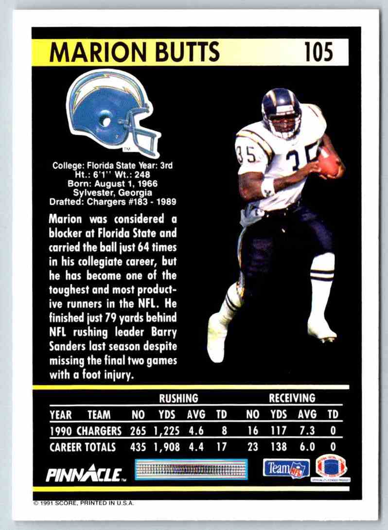 This 1991 Pinnacle Marion Butts #105 card is the perfect addition to any football fan's collection. This card features a classic color headshot of Marion Butts in his San Diego Chargers uniform. The card is printed on high-quality cardstock and is in near mint condition. Its vibrant colors make it stand out from the rest. This card is an ideal way to commemorate the career of this talented NFL star. Add it to your collection today and show your appreciation for the legacy of Marion Butts.
