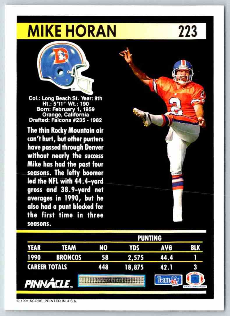 This 1991 Pinnacle Mike Horan #223 card is the perfect addition to any collection! Bright colors and a sleek design showcase the former quarterback's dynamic style. The card's textured surface adds a unique touch to the design, making it stand out from the crowd. Featuring a photo of Horan in action, this card is sure to be a hit with fans and collectors alike. Whether you're a fan of the player or the sport, this card is the perfect way to show your admiration. Get your hands on this unique piece of sports memorabilia and add a little something special to your collection today!