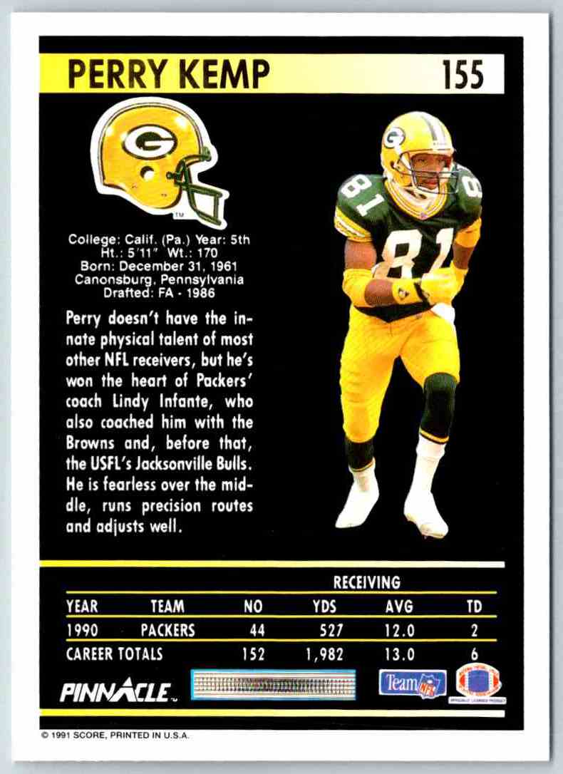 This 1991 Pinnacle Perry Kemp #155 trading card is a must-have for any football fan. This card features a crisp, clear image of Kemp on the front along with his vital career stats on the back. The card is made of high-quality cardstock and is sure to last for years to come. Add this card to your collection today to show your support for this Hall of Fame player.