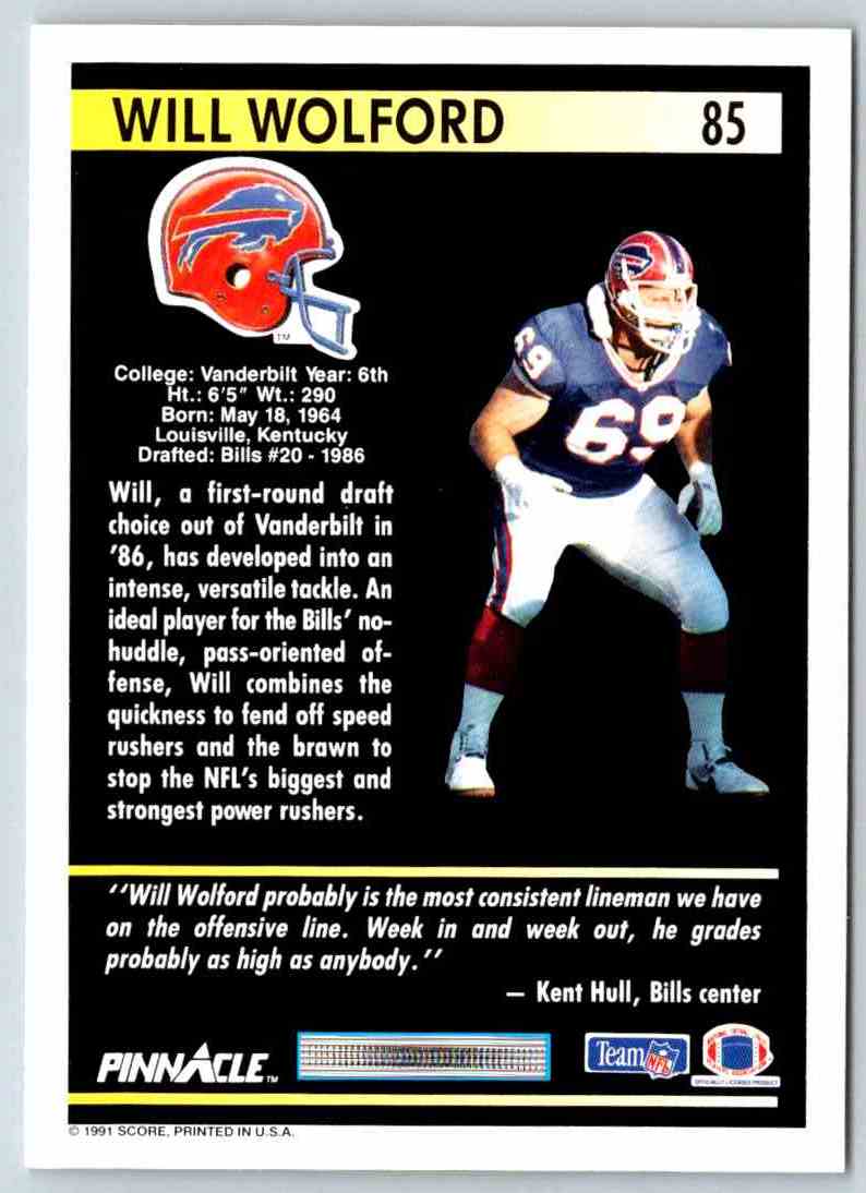This 1991 Pinnacle Will Wolford #85 trading card is an absolute must-have for any football fan! It features a close-up portrait of the Buffalo Bills offensive tackle and two-time Pro Bowl selection. The vivid colors, high-resolution image, and precise detail make this card the perfect addition to any sports memorabilia collection. The card is in excellent condition and ready to be framed and displayed proudly. Add this valuable item to your collection today and take your memorabilia to the next level.
