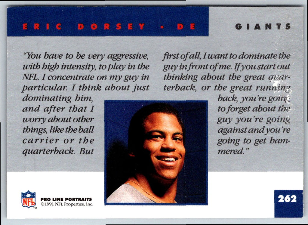 This 1991 Pro Line Portraits Eric Dorsey #262 from the New York Giants is a great addition to any fan's collection. The card features a detailed portrait of Dorsey with the Giants colors and logo prominently featured. The card's back includes Dorsey's career stats, making it a great way to celebrate his storied career. This card is perfect for any fan of the New York Giants, or any collector looking for a unique piece of NFL memorabilia. Add this card to your collection today!