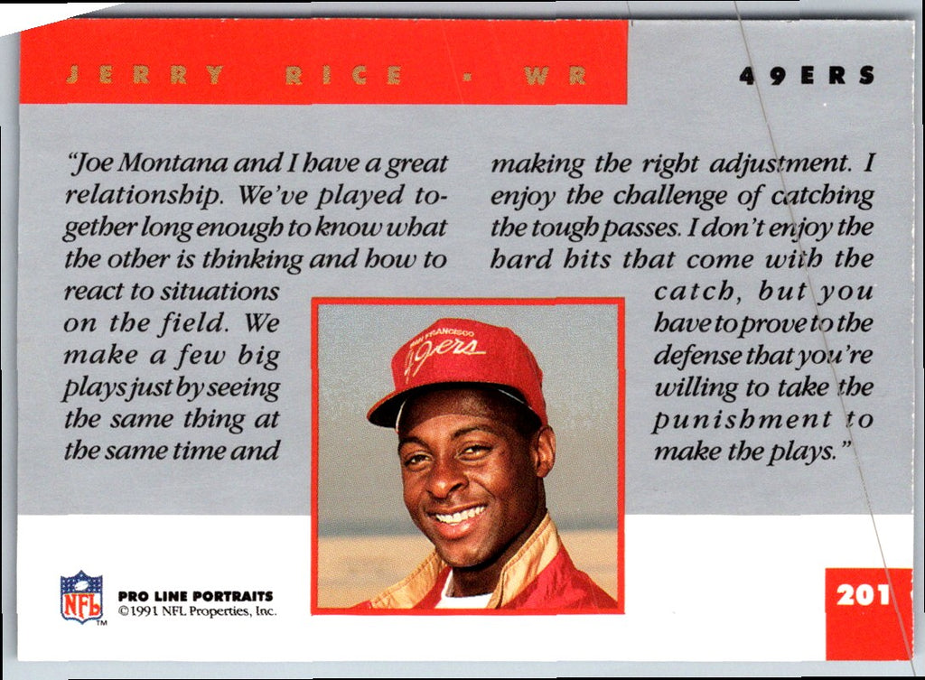This 1991 Pro Line Portraits Jerry Rice #201 card is a must-have for any San Francisco 49ers fan! It features a beautiful color image of the legendary receiver in his classic uniform. The card honors Rice's outstanding career accomplishments, including his 11 Pro Bowl selections and 3 Super Bowl championships. The card's reverse side includes Rice's season-by-season stats and awards, making this an essential piece of memorabilia every 49ers fan should own!
