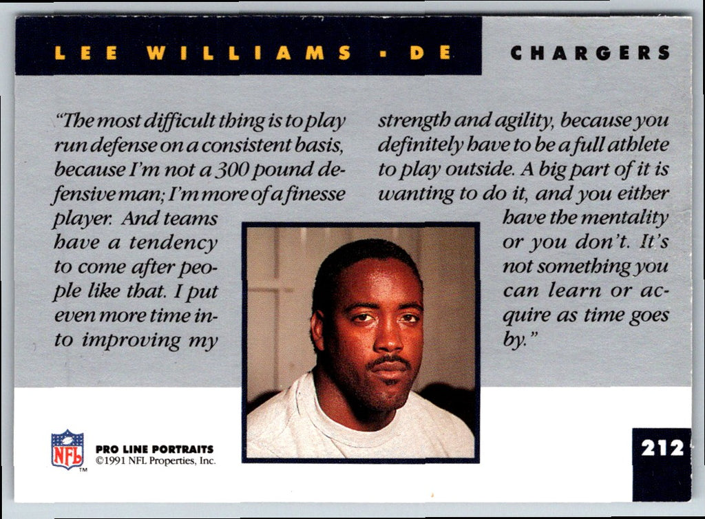 This 1991 Pro Line Portraits card of Lee Williams from the San Diego Chargers is a great piece for any collection. A two-time Pro Bowler, Lee Williams was known for his impressive pass rushing skills, amassing an impressive total of 64.5 sacks over the course of his 12 year career. Featuring the Chargers' classic jersey and helmet, this card captures the excellence of a great defender. Add this card to your collection and relive the glory of one of the greatest defensive lineman of all time.