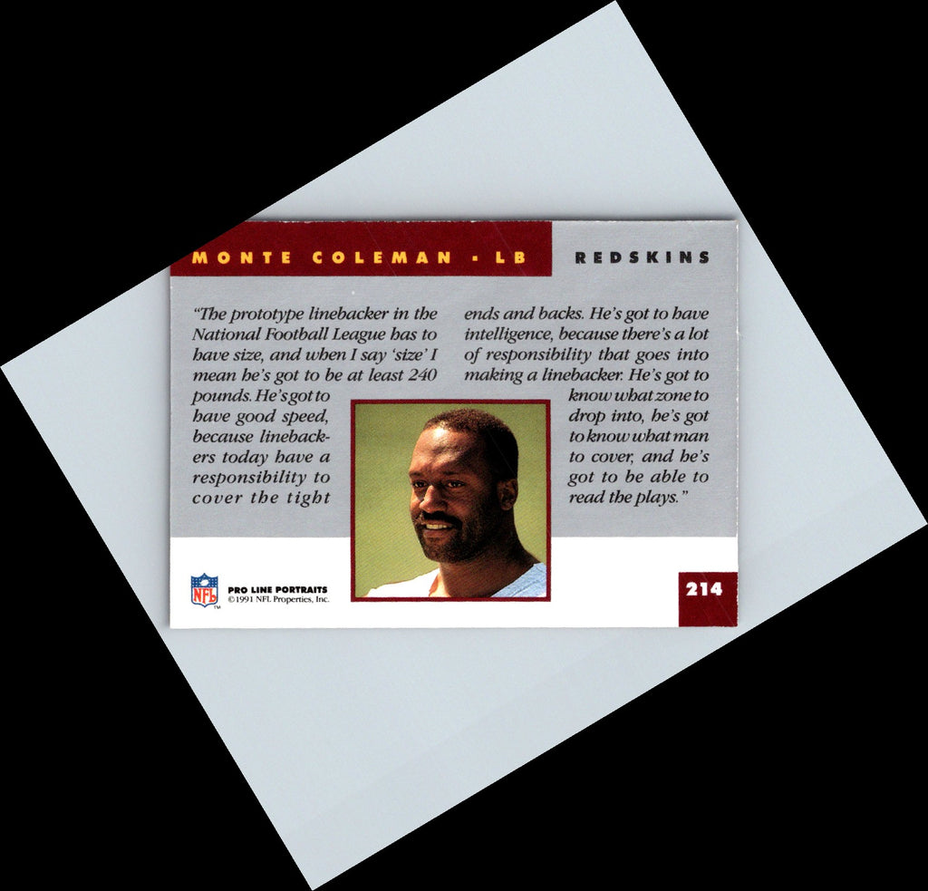 This 1991 Pro Line Portraits Monte Coleman #214 card from the Washington Redskins is a must-have for any serious collector. Featuring a classic color photo of Coleman in action, this card is a perfect reminder of one of the Redskins' all-time greats. The card's crisp, clean design and bold colors bring Coleman's iconic image to life. Add this timeless piece to your collection today and remember a true Redskins legend.
