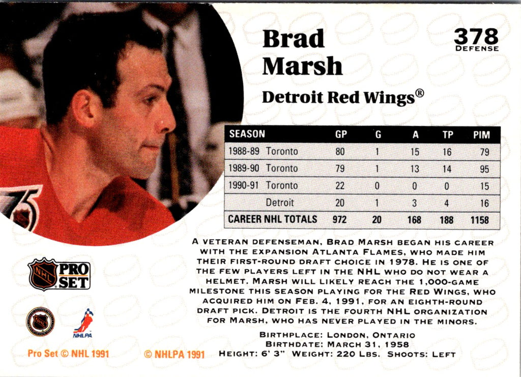 A must for Red Wings fans, this 1991 Pro Set Brad Marsh #378 trading card shows the defenseman in full Red Wings garb. Marsh was a key member of the Red Wings during the 1991 season, and this card captures him in action. Get your hands on this classic trading card and add it to your collection today!