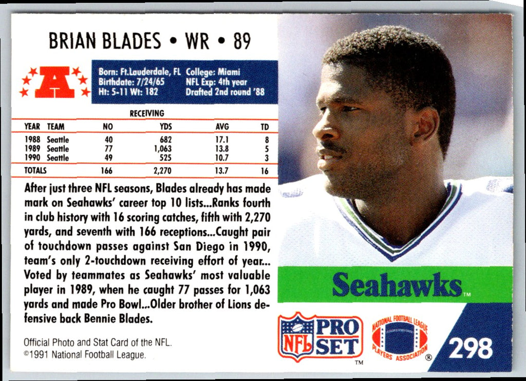 Make sure you add the 1991 Pro Set Brian Blades #298 card to your collection of Seattle Seahawks memorabilia. This card features a striking image of Blades in his Seahawks uniform and highlights his career stats in the back. With vibrant colors and a glossy finish, this card is sure to be a standout in your collection. Show your support for your favorite team with this unique card. Get your hands on this one-of-a-kind item and add it to your Seahawks collection today!