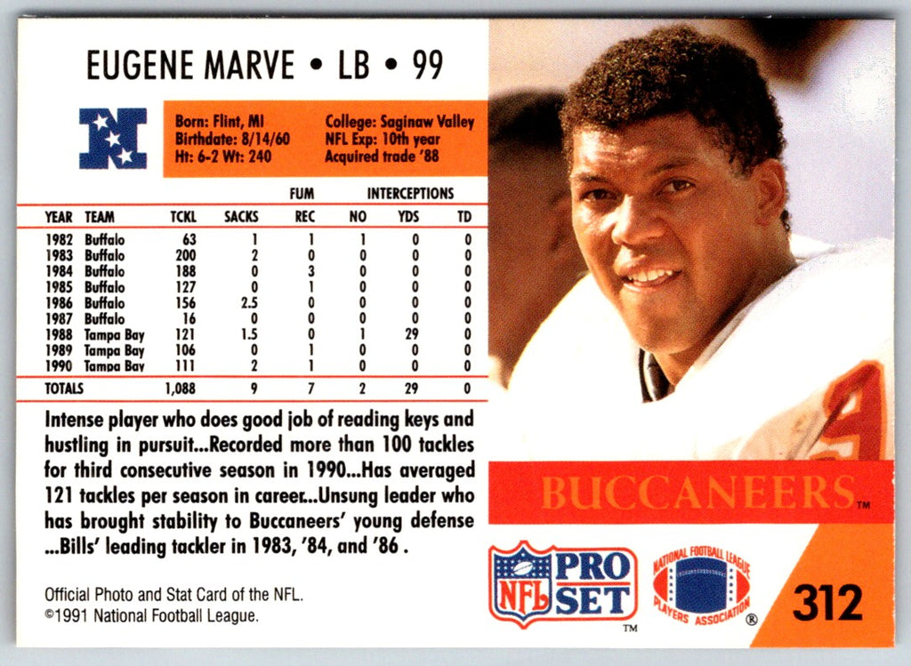 This 1991 Pro Set Eugene Marve #312 card features a stunning portrait of the Tampa Bay Buccaneers quarterback in his classic team uniform. This card is perfect for any collector, as it captures the essence of the game and the spirit of the team. With bright colors and crisp details, this card is sure to take center stage in any collection. Add it to your collection today!