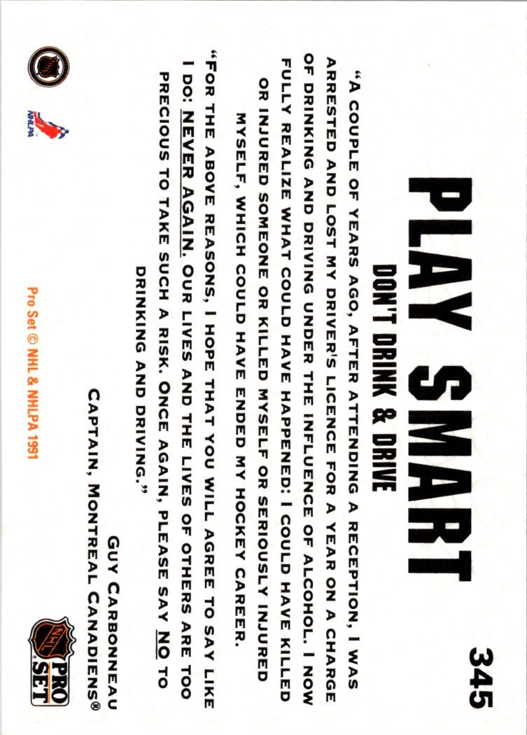 This 1991 Pro Set French Guy Carbonneau #345 Montreal Canadiens trading card is a great addition to any hockey fan's collection! Featuring stunning photography and vivid colors, this card is sure to make an eye-catching display. Carbonneau was an integral part of the Canadiens' success in the 1990s, and this card is the perfect way to commemorate his career. A must-have for any Canadiens fan or collector!