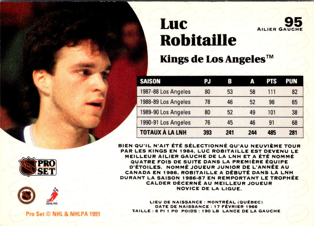 This 1991 Pro Set French Luc Robitaille card is the perfect edition for any collector. Featuring a classic image of Luc Robitaille in his Los Angeles Kings uniform, this card will be a great addition to any hockey fan's collection. The card is printed on high-quality cardstock and features vibrant colors that will make it stand out in your collection. This card is the perfect way to honor the great career of Luc Robitaille and show your support for the Los Angeles Kings.