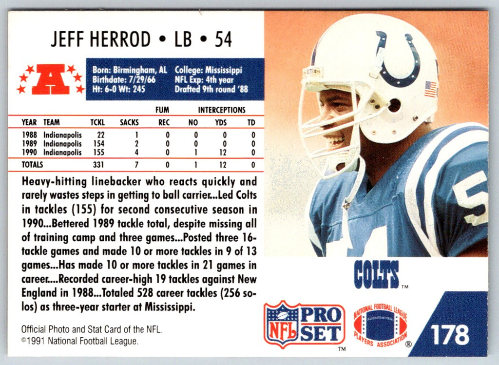 Jeff Herrod was a linebacker in the NFL and played for the Indianapolis Colts from 1991-1998. This 1991 Pro Set Jeff Herrod card #178 is a great way to relive the glory days of the Colts. Herrod was a leader on the defense and his card is a must-have for any football fan. It features a large color photo of Herrod in action on the field and a full-color border. The back of the card has a full career stats listing and a short biography of Herrod. It also has a picture of the Colts' team logo. This card is a great way to commemorate the success of the Indianapolis Colts and Jeff Herrod's career. Get this card today and celebrate the history of the Colts!