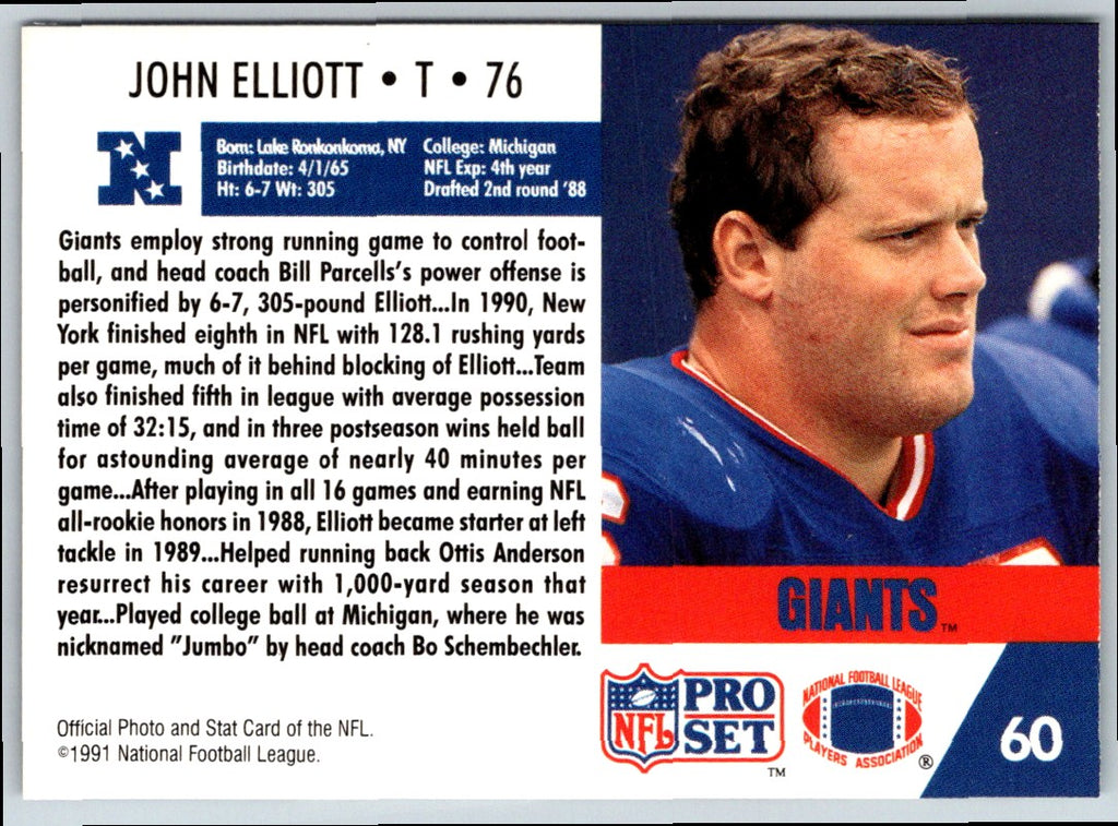 John Elliott was a key member of the New York Giants' offensive line during the 1990s and helped the team to their first Super Bowl victory in 1990. This 1991 Pro Set card captures Elliott in his iconic Giants uniform and is the perfect way to add a piece of Giants history to your collection. The card features sharp and vibrant colors, making it a must-have item for any Giants fan. The card is sure to make a great addition to any collection and will be a great conversation starter. Get your hands on this unique collectible today!