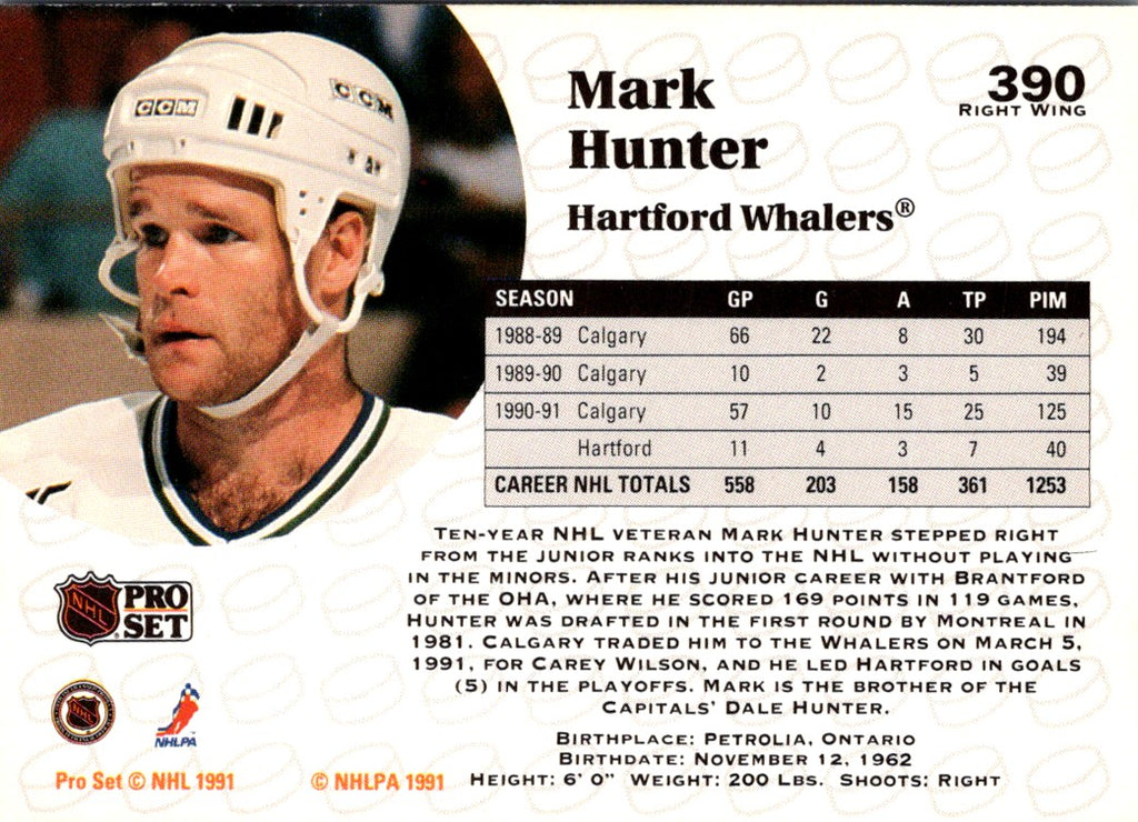 This 1991 Pro Set Mark Hunter #390 Hartford Whalers card is an essential for any hockey fan. Featuring a full-color photo of Mark Hunter in his home-team Whalers jersey, this card is sure to make a great addition to any collection. With his number and team name on the front, and vital career stats and information on the back, this card is sure to make a great addition to any hockey fan's collection. Get your hands on this piece of hockey history and add it to your collection today!