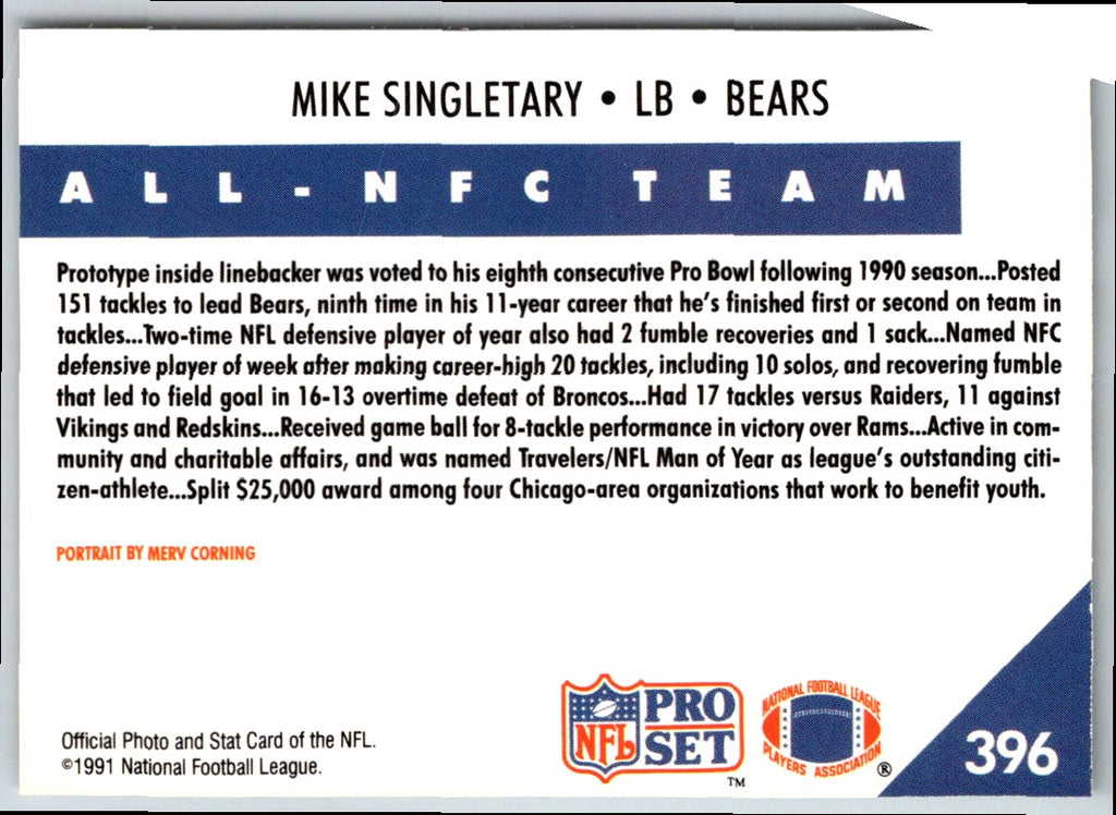 This 1991 Pro Set Mike Singletary #286 Chicago Bears card is a must-have for any fan of the legendary Hall of Fame linebacker. Featuring Singletary in his iconic Bears uniform, this card is a great way to commemorate the career of one of the greatest defensive players in NFL history. Perfect for any Bears fan or collector, this card is sure to make a great addition to any collection.