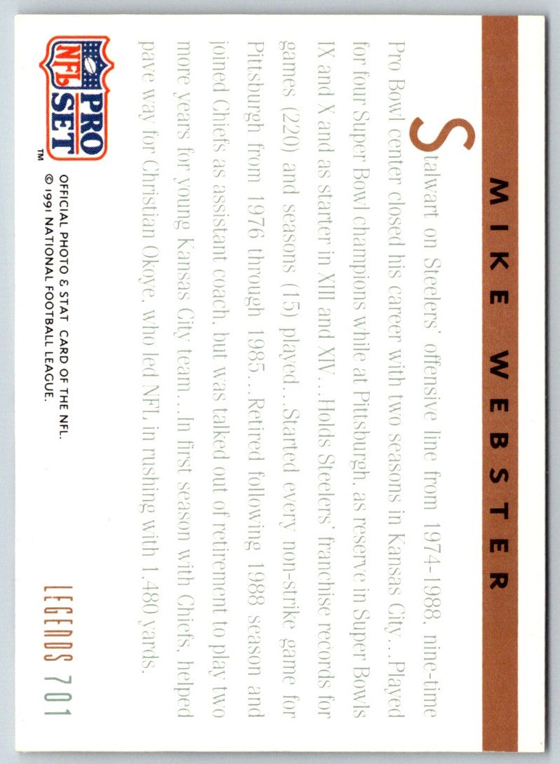 This 1991 Pro Set Mike Webster #701 card is a must-have for any Pittsburgh Steelers fan! Featuring a full-color photo of Webster in action, this card is sure to bring a smile to any fan's face. Made with a premium cardstock, this card will last for years to come. With vivid colors and crisp detail, this card is perfect for any collection. Whether you're looking to add to your Steelers collection or start a new one, this card is the perfect addition!