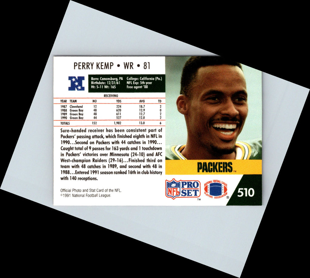 This 1991 Pro Set Perry Kemp card #510 is a must-have for any Green Bay Packers fan. Featuring the team logo and Kemp in full uniform, this card is the perfect addition to any collection. The card is in near-mint condition and features crisp, bright colors that will stand out in any display. With sharp corners and edges and no signs of wear, this card is sure to be a fan favorite. Add it to your Packers collection today and show your team pride!