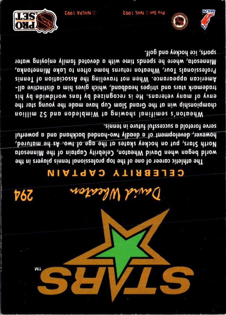 David Wheaton is a former professional tennis player and this Pro Set Platinum card features him in his Minnesota North Stars uniform. Wheaton played for the North Stars from 1990-91 and was an important part of the team. This card is the perfect collectible for any fan of the North Stars or of David Wheaton. The card features a full-color action photograph of Wheaton and the Minnesota North Stars logo. It is a great way to commemorate the team and Wheaton's time with them. Add this card to your collection today!