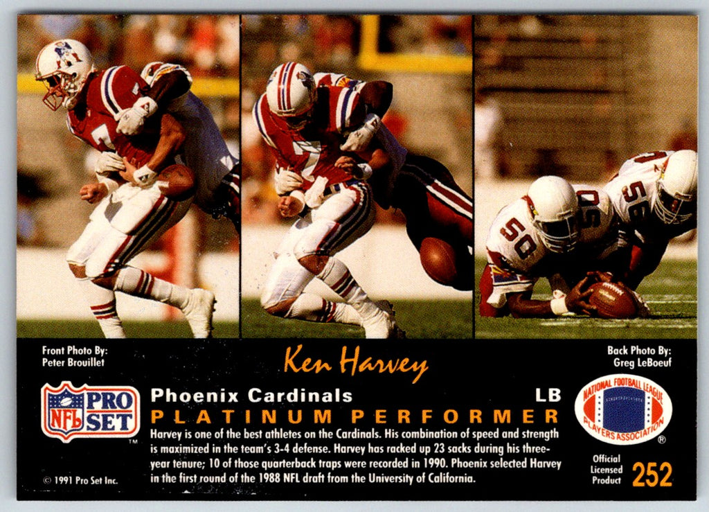 This 1991 Pro Set Platinum Ken Harvey #252 Phoenix Cardinals card is a must-have for any collector or fan. The card features a classic image of the Cardinals' legendary linebacker on the field, striking a powerful and triumphant pose. Show your support for the team and the player with this card, which captures the spirit of the game and the glory of victory. With its vibrant colors, bold text, and stunning design, this card is sure to make a statement in any collection. Add it to yours today!