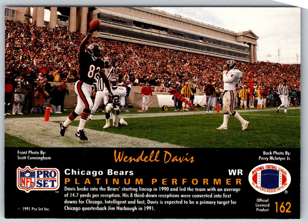 This 1991 Pro Set Platinum Wendell Davis #162Chicago Bears football card is a must-have for any Bears fan's collection! Featuring Wendell Davis in his classic Bears jersey, this card showcases his incredible talent and leadership on the field. You'll be able to appreciate the stunning artwork and printing details that make this card stand out from the rest. An essential piece of memorabilia for any Bears fan!