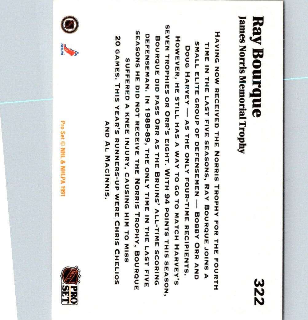 This 1991 Pro Set Ray Bourque #322 Boston Bruins card is a must-have for all serious hockey card collectors! It features a high-quality image of Ray Bourque in his full Boston Bruins uniform, as he was one of the most iconic players in NHL history. The back of the card includes a detailed biography of the player, as well as his career stats. This card is sure to be the highlight of any hockey card collection! Get your hands on this timeless piece of hockey history today!