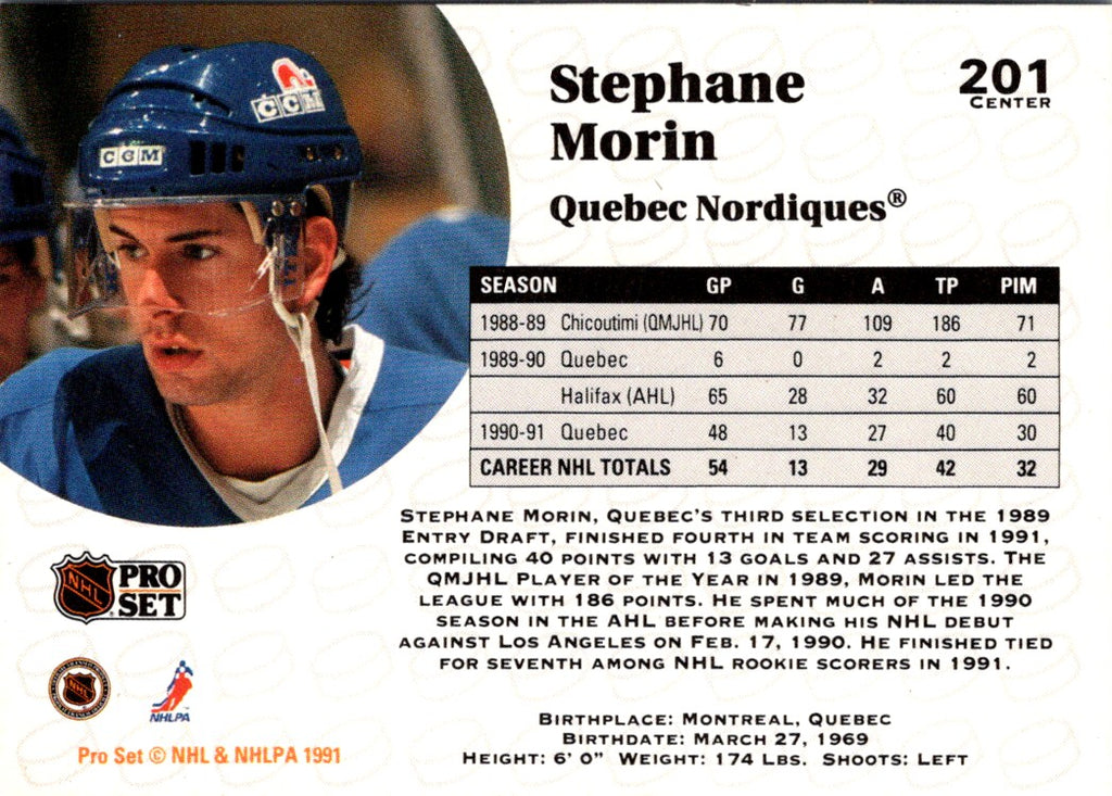 This Stephane Morin #201 Quebec Nordiques card from Pro Set in 1991 makes a great addition to any hockey fan’s collection. Featuring a dynamic action shot of Morin in his Nordiques uniform, this card is a perfect way to celebrate the career of this former NHL player. The card is printed on high-quality cardstock and features a crisp, vibrant image that will bring back memories of past games. Collectors will appreciate the card’s detailed stats on the reverse side, including Morin’s team, position, games played, goals, assists, and more. Add this must-have card to your hockey collection today and relive the action of the 1991 season.