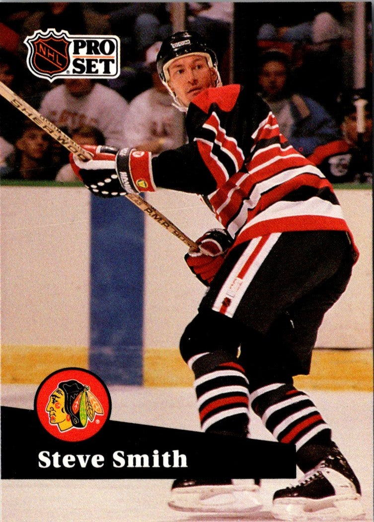This 1991 Pro Set Steve Smith #370 Chicago Blackhawks card is a must have for any hockey fan! The card features a full color photo of Smith in his Blackhawks uniform. The back of the card showcases his stats for the 1990-1991 season, as well as career stats. Smith is a Hockey Hall of Fame inductee and was a major contributor to the Blackhawks' success. This card is sure to be a great addition to any collection!