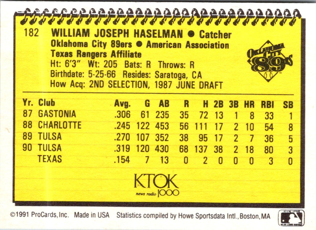 This 1991 ProCards Oklahoma City 89ers card features Bill Haselman, a former catcher and first baseman in Major League Baseball. This card is sure to be a great addition to any baseball card collection. The card captures Haselman during his stint with the Oklahoma City 89ers, showing a professional headshot of the player in his team uniform. The card features the team logo and colors, making it a great item for any fan of the team. Get your hands on this card and add it to your collection today!