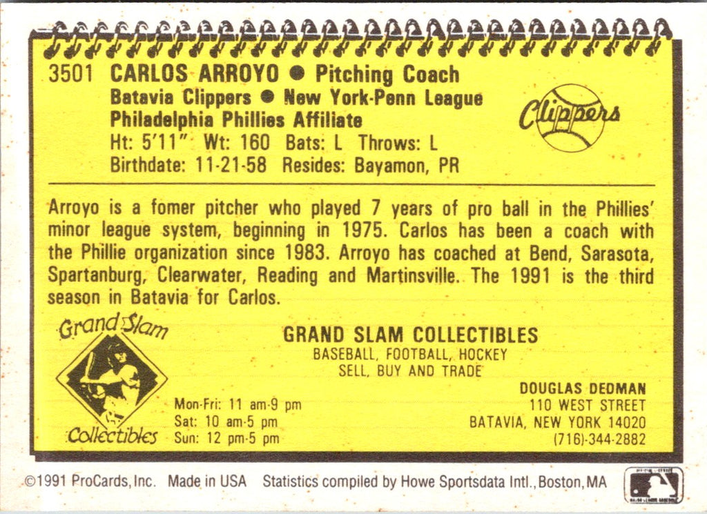 Introducing the 1991 ProCards Carlos Arroyo #3501 Batavia Clippers! This card celebrates the standout career of Carlos Arroyo, a player who made an impact on the court and off the court. The card features a unique design, with vibrant colors and a crisp image of Carlos Arroyo. It captures a moment in time, and is sure to be a great addition to any sports card collection. This card is sure to bring a smile to any fan of Carlos Arroyo, and will be a great way to show your admiration for this talented athlete. Get your hands on this special card today!