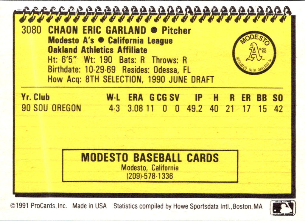 This 1991 ProCards Chaon Garland #3080 Modesto A's card offers an incredible collectible for any fan of Chaon Garland. Featuring a vibrant design, this card is the perfect addition to any collection. It is in mint condition, and is sure to be a treasured item for years to come. With its vivid colors and excellent print quality, this card is sure to become a favorite in your collection. Whether you are a fan of Chaon Garland or just a collector of baseball cards, this card is sure to bring you joy and pride. Add it to your collection today!