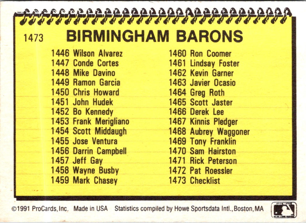This 1991 ProCards Checklist #1473 Birmingham Barons card features a full-color photo of the team in action. It is the perfect item for any Barons fan, to add to their collection or to commemorate their favorite team. The card is printed on high-quality card stock, making it durable and long-lasting. With the team logo and full color photo, this card is sure to bring back memories of the Barons for years to come. Grab this card today and show your support for the Birmingham Barons!