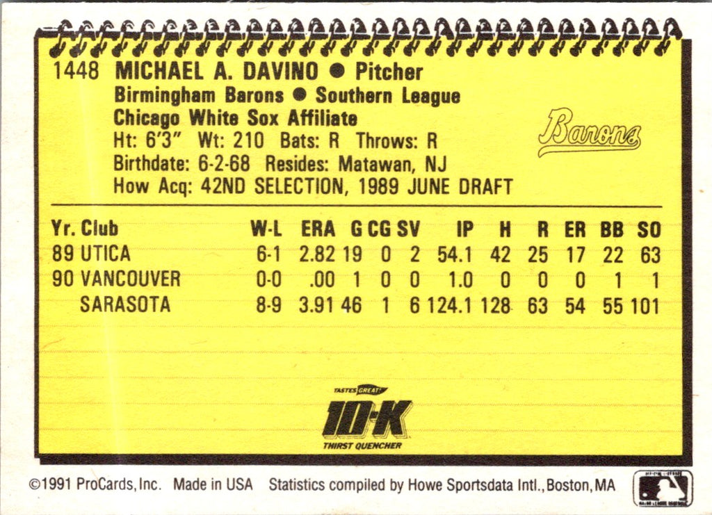 This 1991 ProCards Mike Davino #1448Birmingham Barons trading card features a high-quality glossy finish and vibrant colors that capture his classic style. With a detailed action shot, this card is perfect for any fan of the Birmingham Barons or Mike Davino. The back of the card includes detailed biographical information about Mike and stats from his 1991 season. A must-have for any fan and collector, this card is sure to bring back memories of the great season Mike had with the Barons. Add it to your collection today!