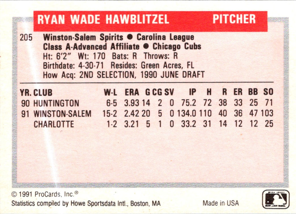 Description: 1991 ProCards Tomorrow's Heroes Ryan Hawblitzel #205