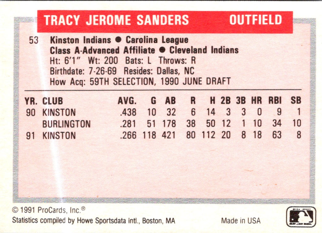 This 1991 ProCards Tomorrow's Heroes card features Tracy Sanders #53 of the Kinston Indians. It's the perfect addition to any collection of sports memorabilia. The card is printed on high-grade card stock with a glossy finish, so it's sure to stand the test of time. It features an action shot of Sanders with the Kinston Indians logo in the background. The card is in mint condition and is a must-have for any fan of the Kinston Indians. Add it to your collection today!