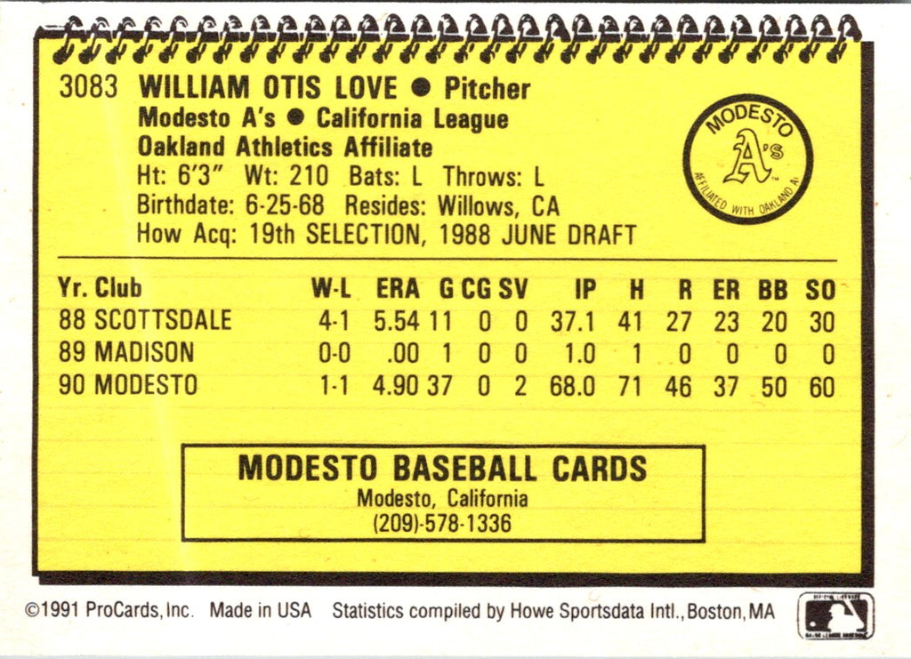 This 1991 ProCards Will Love #3083 Modesto A's card is an essential item for any baseball fan's collection. Featuring vivid colors, sharp corners, and a glossy finish, this card captures the look and feel of a classic baseball card. With an image of the Modesto A's team and all of their player's names listed on the back, this card is sure to be a conversation starter and a great addition to any collection. Make sure you don't miss out on this great piece of baseball history!