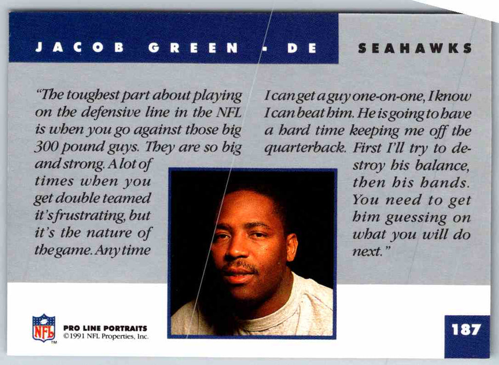 This 1991 ProLine Jacob Green #187 trading card is a must-have for any die-hard football fan! With its vibrant colors and sharp details, this card portrays the Seattle Seahawks' Hall of Fame defensive end in all his glory. A great addition to any memorabilia collection, this card is sure to bring back fond memories of Green's storied career. A perfect gift for any football enthusiast, this card is sure to make them smile. Get your hands on this piece of history today!